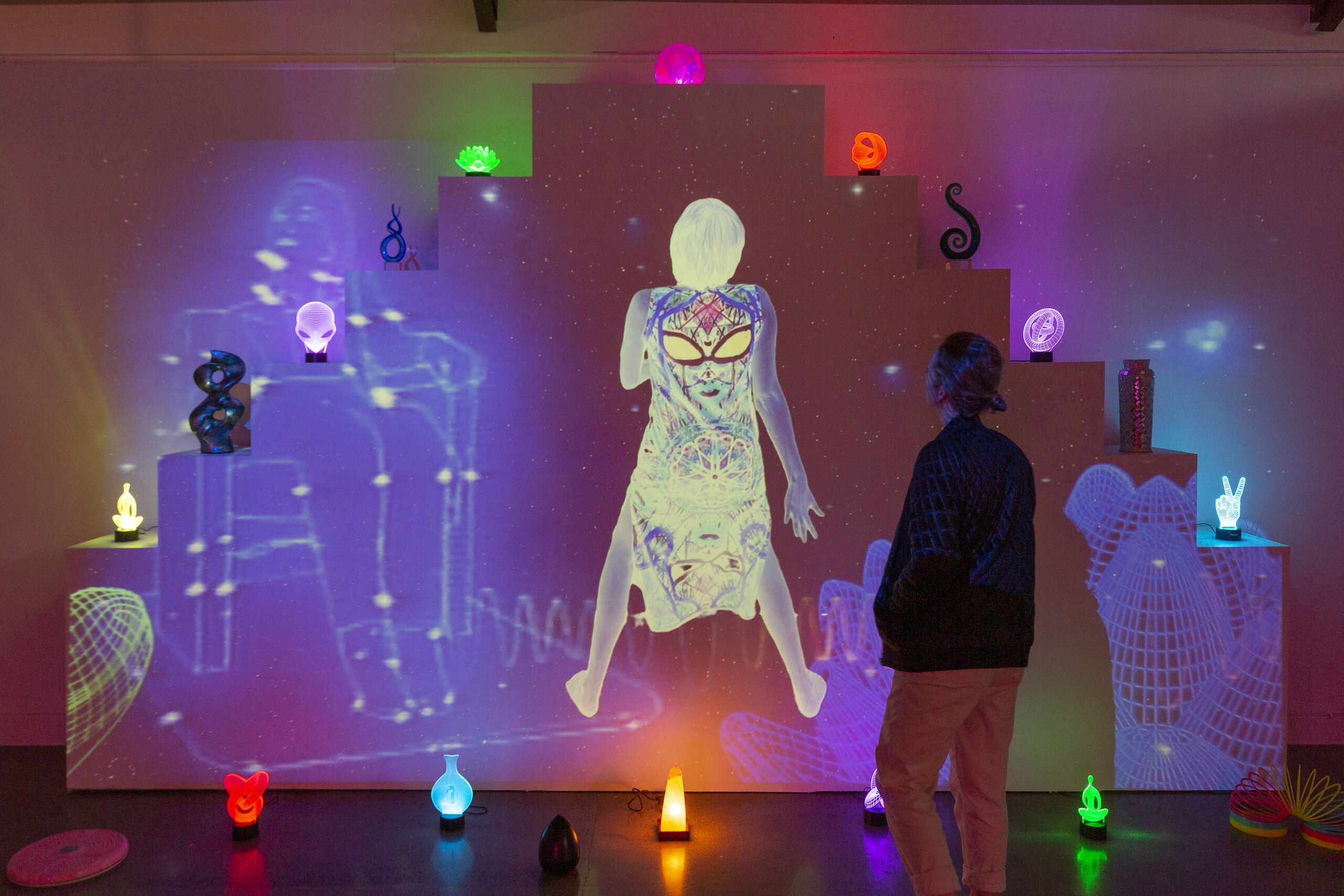 Upstairs, on the mezzanine floor, is Shana Moulton’s Whispering Pines (2018), described as an “internet soap opera”. This is the most recent instalment in a video art series Moulton began in 2002. In fact, the new work premiered online as seven discrete chapters spanning about five minutes each. In Soul Seeker, these chapters are stitched together into one seamless narrative. Moulton’s alter ego Cynthia is the protagonist, a dreamer and hypochondriac who spends a lot of time drifting between cosmic and domestic space. Unlike Wong’s invisible superhuman, Cynthia does not crave discipline but comfort, seeking out therapeutic treatments to anesthetise and beautify her life. Her home is a colourful and cluttered environment filled with kitschy New Age objects: Yoga figurines, a touch lamp decorated with dolphins, a teardrop shaped humidifier, crystals and retro fitness gadgets. In the first chapter, she is cocooned in products that come to life and begin dancing cartoonishly, beckoning and overwhelming her. The visual experience of Whispering Pines is like browsing the internet, almost like watching digital origami. The images turn and twist, fold and wrap. All of the objects are modular and detachable, along with Cynthia herself, who is dissected and recomposed multiple times.