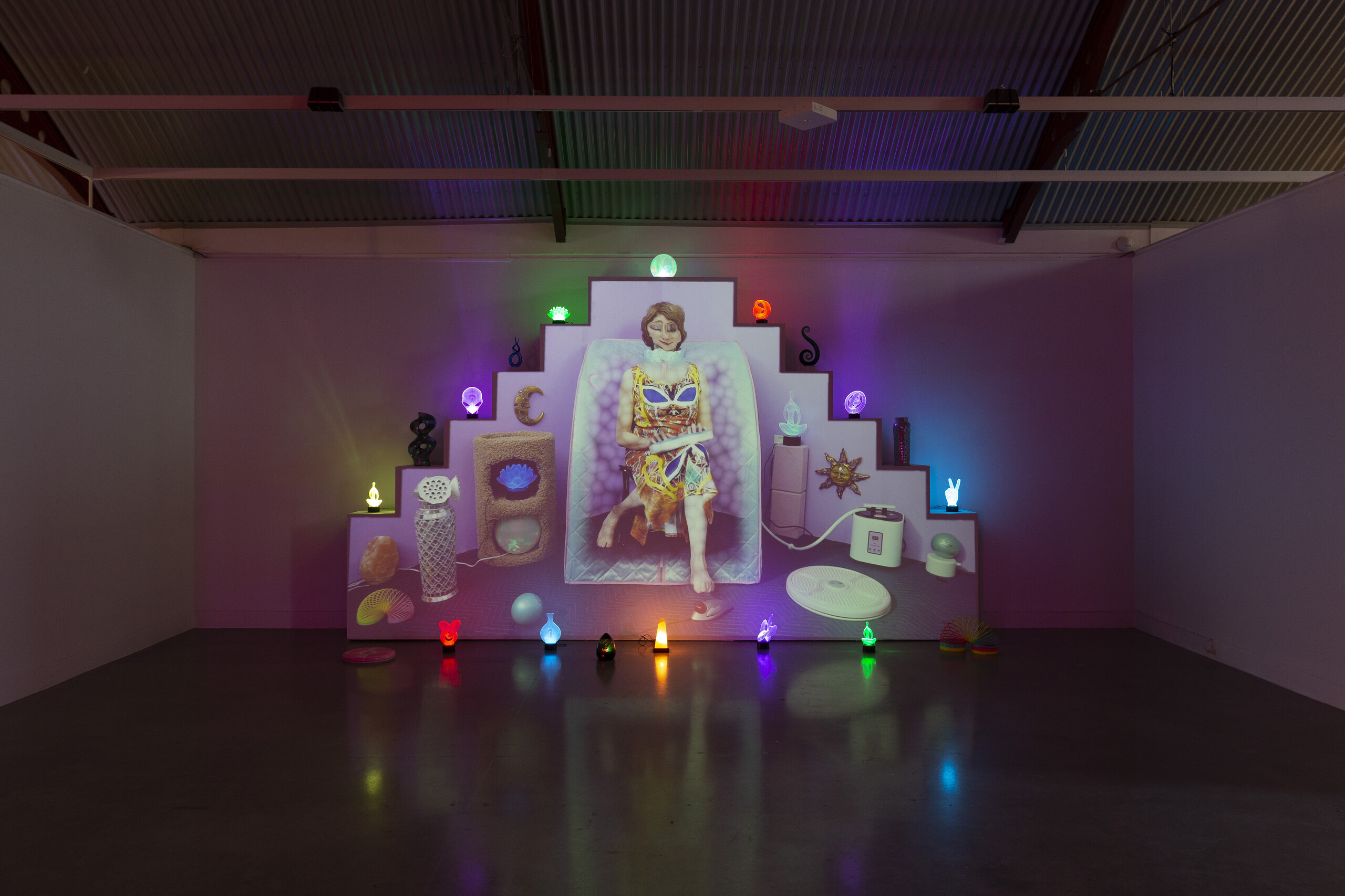 These are the two paradoxical impulses underpinning the restlessness of Cement Fondu’s current exhibition, Soul Seeker. On the one hand, there is the pursuit of spiritual transcendence and salvation that aspires to a place of calm and peace. And then, on the other, there is the relentless commodification of that pursuit, sucked into the hustle and grind of aggressive self-optimisation. Soul Seeker is the fourth in an annual series of exhibitions pairing the work of a local early career artist with an established international artist. This iteration pairs local Sydney artist Min Wong with the California-based Shana Moulton, drawing out their shared engagement with “New Age” culture. As the show reveals, there is no single, homogenous New Age culture; it is better conceived of as a late 20^th^/early 21^st^ century bricolage of religions, spiritual beliefs, symbols and rituals. Wong’s sculptural and installation practice, for example, explores the visual language of esoteric traditions, drawing on Christian, Taoist, and neopagan influences, together with her investment in extreme and cultic forms of fitness, such as Bikram Yoga and CrossFit. Moulton works across video, sculpture and performance to offer a more surrealist engagement with self-care industries as a trap for women, composing vivid domestic spaces that are at once placating and claustrophobic. In a tale almost as old as time, the quest to escape capitalism is absorbed back into its coercive and exploitative logics.