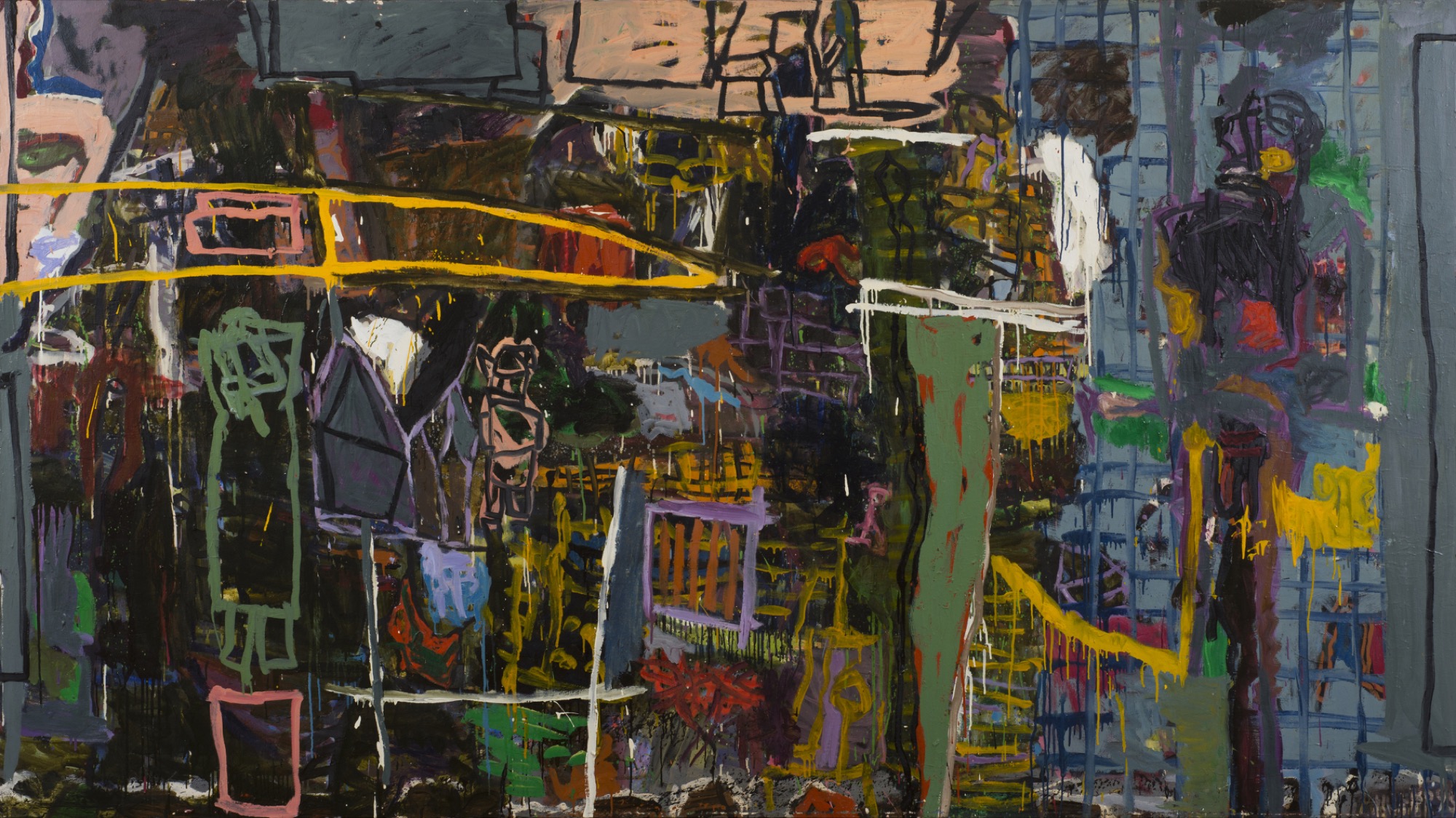 It is this mixture of elements that is taken to delirious extremes in the big canvases of the 1990s with their series of dark patches on the surface, overlaid with wavering silhouettes, gestural criss-crossings, splashes of white paint and meandering marks that lead nowhere, all done in a variety of clashing and eye-watering colours (green on red, purple on orange, violet on mustard).