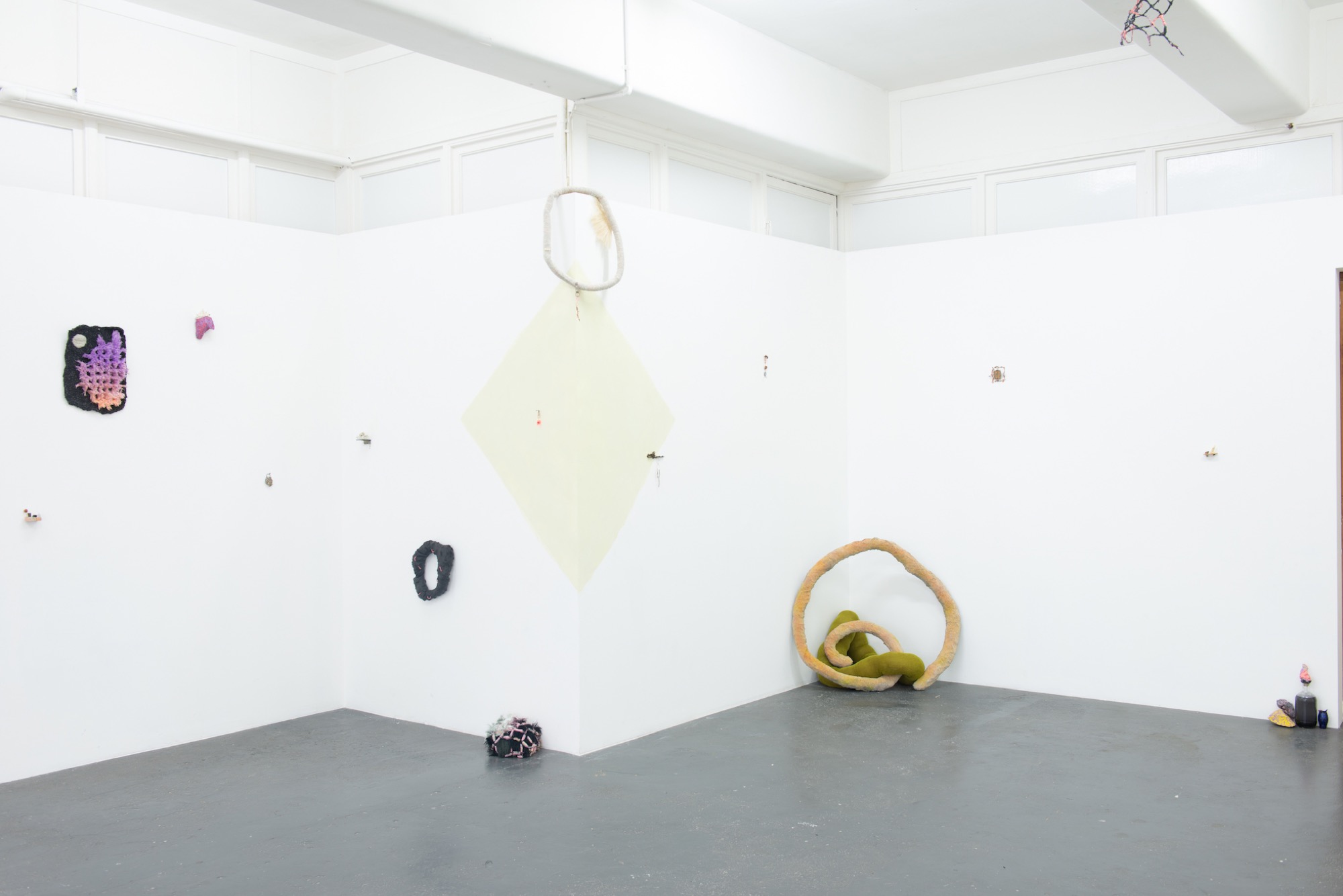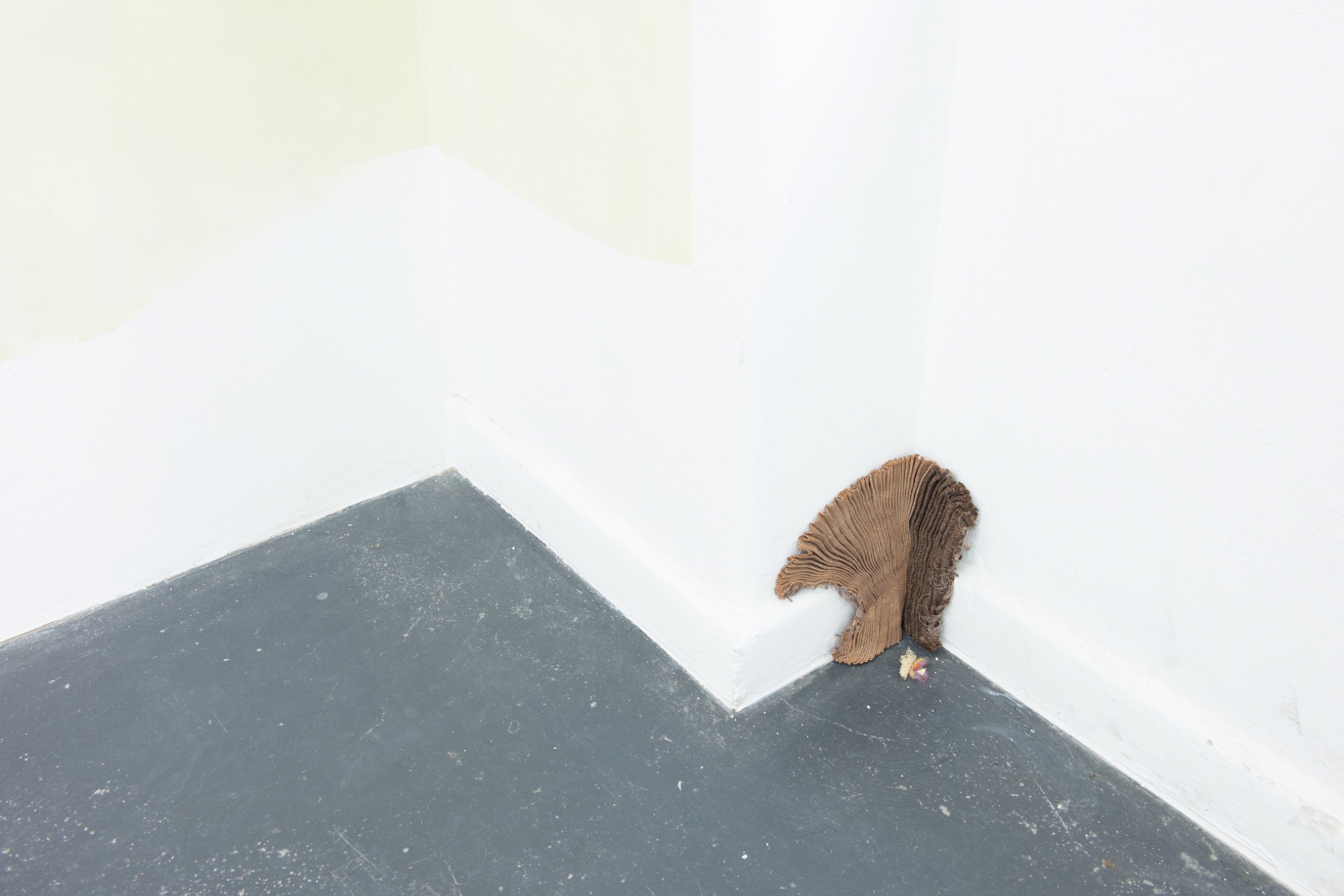 As delicate as it is, work such as Brooks and Tan’s is often at risk of falling into the category of what we art critics sometimes call—mostly in jest—“random stuff on the floor”. Here however, the objects, while seemingly arbitrary, have been dispersed around the gallery with a sense of purpose, or perhaps site specificity. And so, despite the very haphazard nature of the artists’ material choices and combinations, the exhibition avoids all-out anarchy. Nestled into one corner of the gallery, for example, is a sculpture comprised of two soft interconnected hoops—one made from moss-green machine knitted acrylic, the other from paper pulp sprayed an unidentifiable brownish orange-pink—which fit so snuggly into the space (one otherwise shunned by traditional exhibition making) that they appear to be simultaneously in an intimate relationship with one another and growing out of the corner they inhabit.