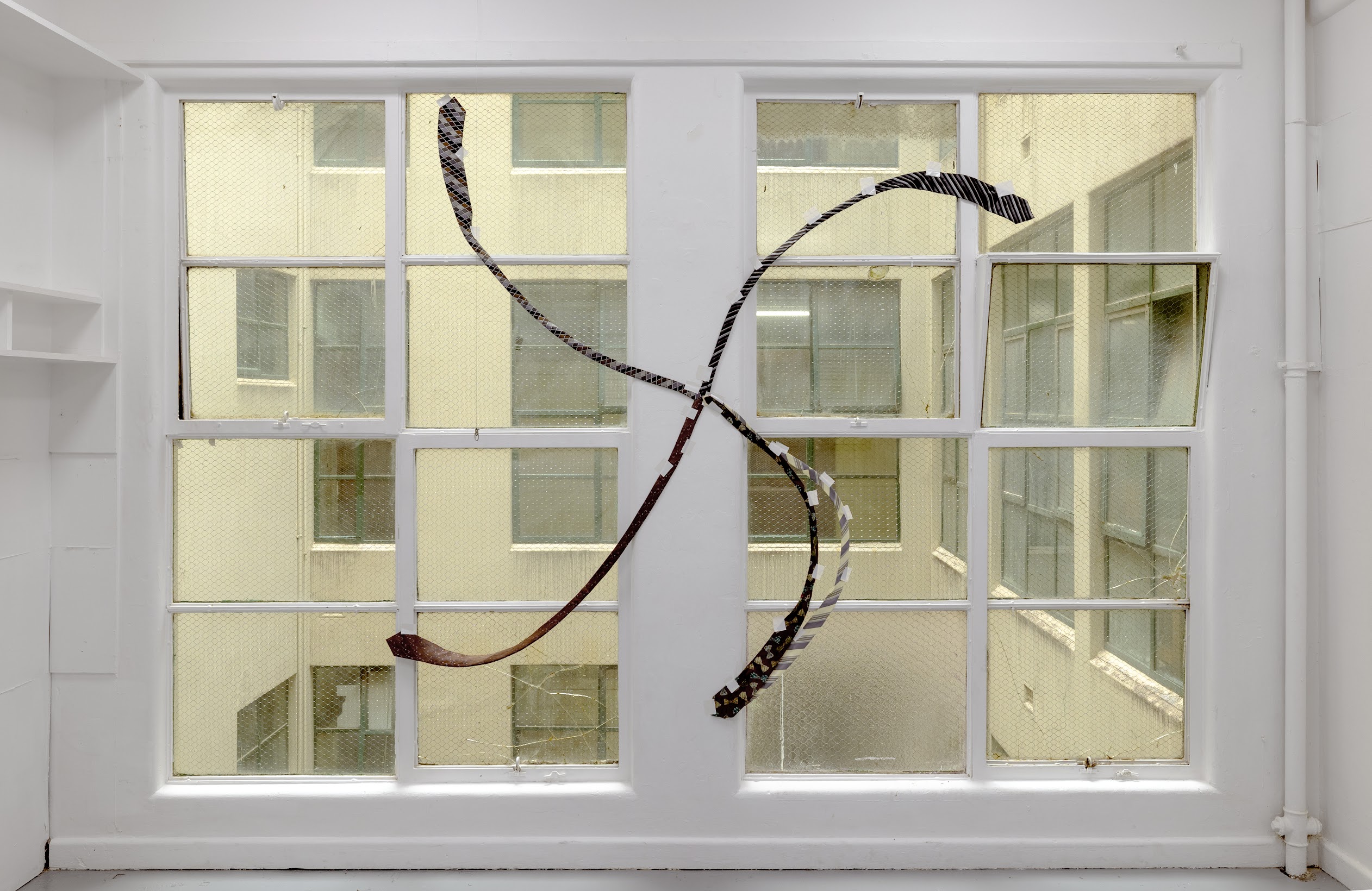 Imhof wouldn’t. Wolfson would, but hasn’t. One recent example of artists who would and did is in the People of Colour exhibition held at Mercy Pictures artist-run gallery in Auckland in 2020. Over four hundred equally-sized flag paintings associated with different nations and organisations were displayed in an affectless, emoji-like provocation which produced substantial backlash. Closer to home is Zac Segbedzi, who has made use of the swastika in his public grappling with his Jewish heritage and familial demons—although West Space did cover the symbol up. The paternal authority neckties that make up Botten’s iterations in The Freedom Show also recall a work shown at Guzzler by another key member of this VCA cohort/ cult: Hana Earles’ hard-edge abstract tie painting, Bruce Earles.