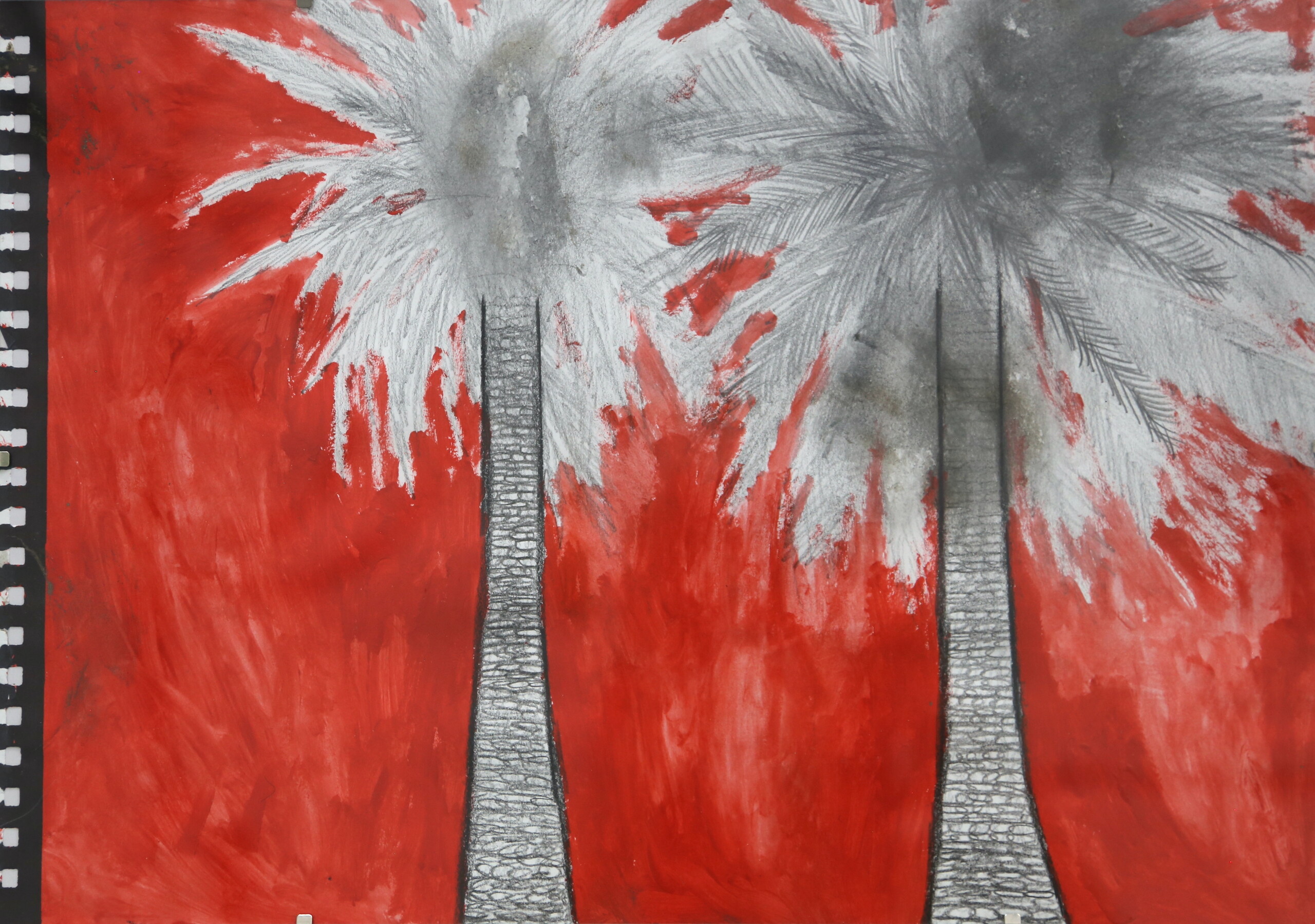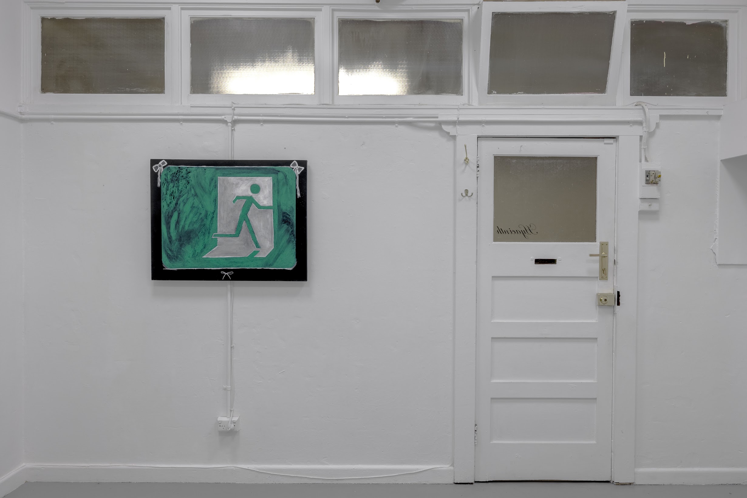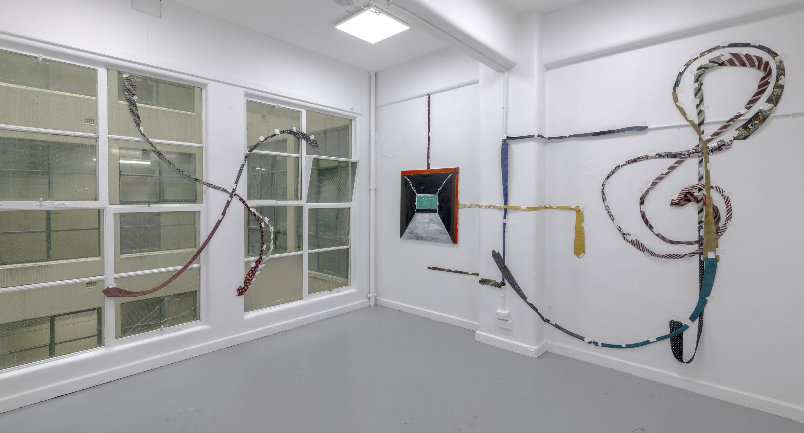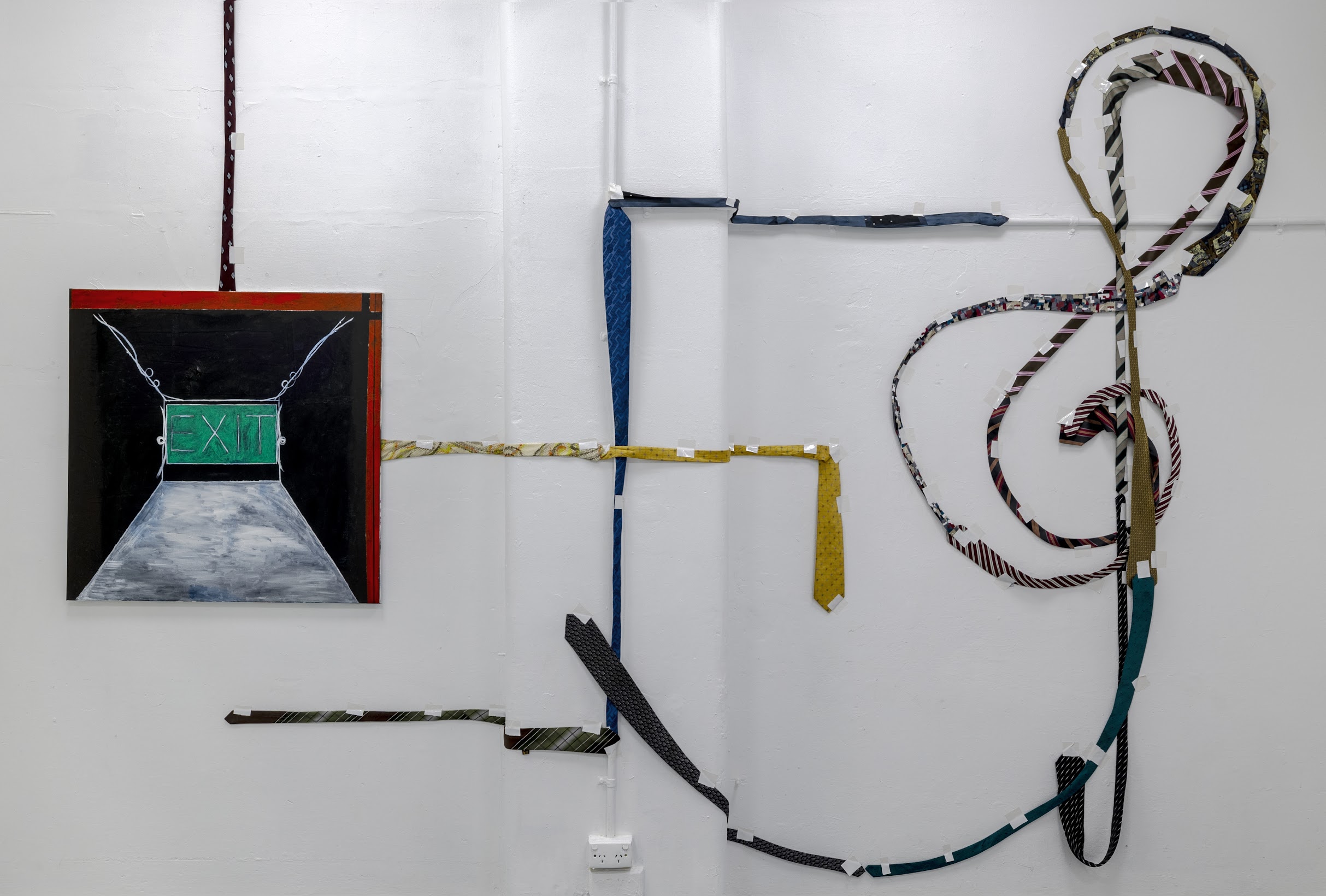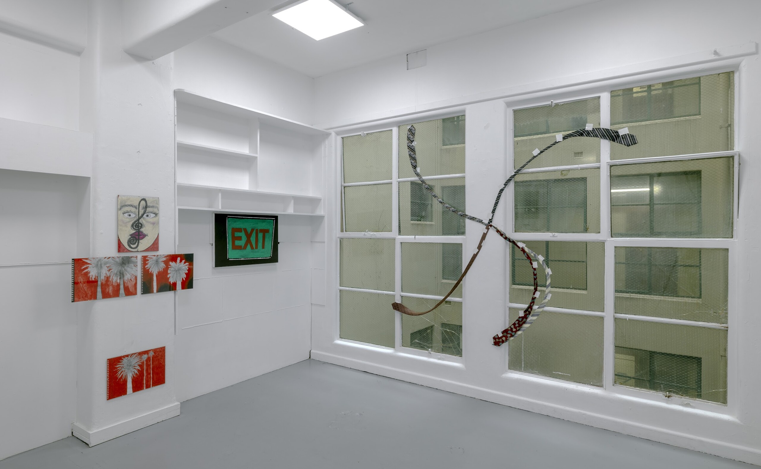 The Freedom Show translates the sensibility of the Spiritual Povera text into material form. Four drawings, three paintings and three wall works are hung in Hyacinth. Symbols that recur throughout the exhibition are within the syntax of the Spiritual Povera universe. In conversation, Botten stressed the importance of “vibrational frequencies” and ambiguous association over any singular interpretation. Why palm trees? Glamour, LA boulevards, movies, but also a malevolent presence (the background is blood red), Adelaide, Footscray… Exit signs reappear in three scuffy paintings. To me, they signified nihilism, out clauses, perhaps a desire to “leave society”. When we spoke about the show, Schmidt said the exit signs reminded her of the so-called Dark Enlightenment. Botten said claustrophobia. And why the neck ties? Death by hanging, fashionable formal wear, the futility of corporate culture… At the opening, the philosopher Vincent Le had a typically psychoanalytic take. “I mean… daddy issues, right?” More on this later.