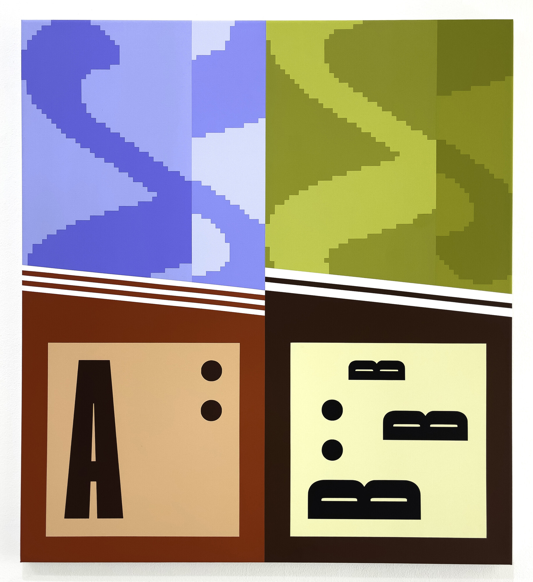 Sutherland is a cerebral modernist. A background in book design informs her interest in typefaces and her perfectly calibrated colour combinations, which exude a precise hum. Her practice is reminiscent of the playful pedagogy of Emily Floyd, Darcey Bella Arnold’s meticulous typesetting and the semiotically dense colour field experiments of Agatha Gothe-Snape. She has also conducted extensive research into queer and lesbian archives in Australia and New Zealand; Sutherland is like if painters Bridget Riley and Josef Albers developed a latent interest in queer theorists Heather Love and Eve Kosofsky Sedgewick.