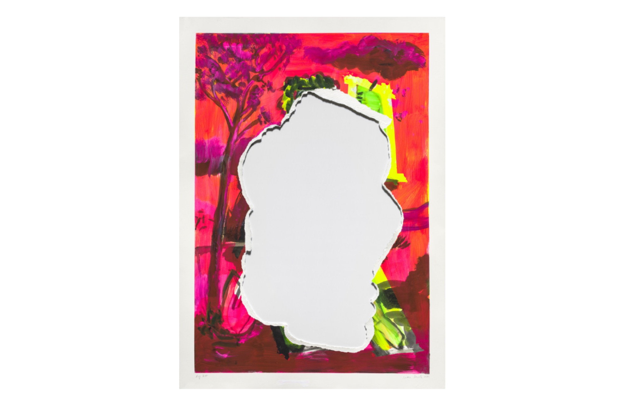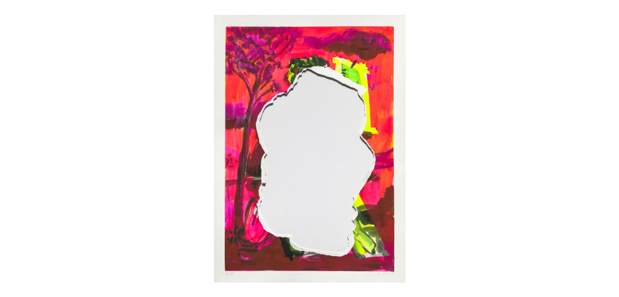 With the most expensive work at the fair—the online host, Artsy has a “Sort by: Price (desc.)” feature—Davila’s enormous canvas Ohhhhhh! (2014) is just big enough to spark joy through my computer screen. I react strongly against his kitsch handling of warm and cool toned paint, but I know that’s the point. Justin Clemens once pointed out that Davila’s colours “are at once quite horrible and quite attractive simultaneously”. Still Life with Bleeding Heart (1992) is even more delightful and contains the fragmented politics of Davila’s classic appropriation era. Yet just as I’m appreciating Davilas-past, the artist’s newest pieces appear to rip some pleasure from the heart of his work. A series of seven works on paper, all attractive in hue, have their centre torn out. Has Davila removed a figure from these landscapes? I am not quite sure, but the holes speak to an undeniable frustration of 2021, along with a kind of wordlessness that feels new for this painter of typically chatty canvases.