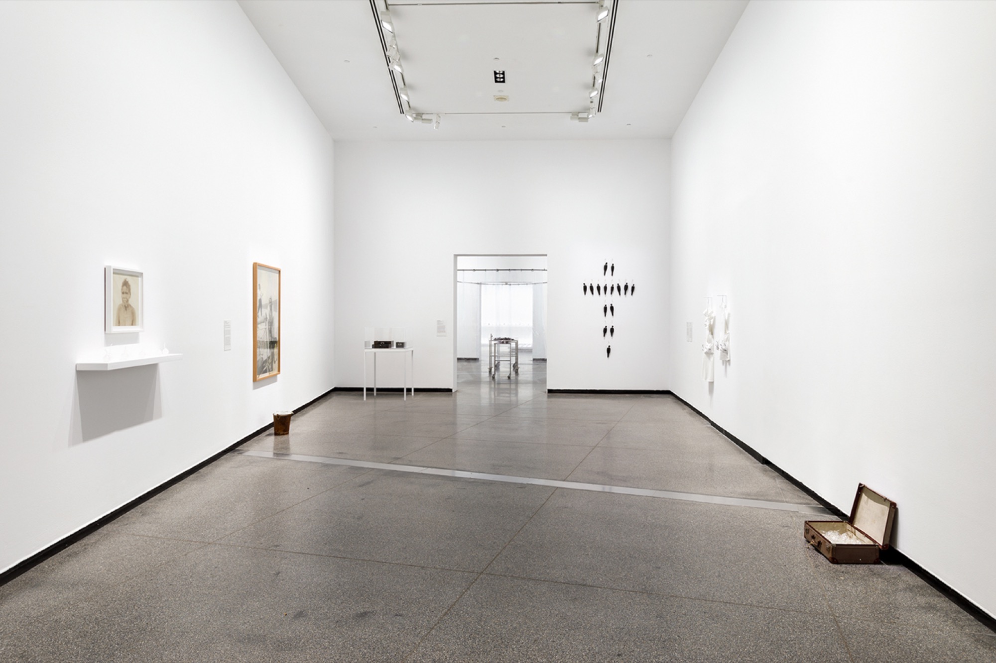 The room-sized installation Weak in colour but strong in blood (2014) was almost unbearable, even though I had experienced the work before at its debut in the 2014 Biennale of Sydney. Three evenly spaced steel trolleys (an echo of Missile Park’s configuration) salvaged from the Ballarat hospital hold three different piles of blown glass sculptures. The trio are enclosed by a clear plastic medical curtain.