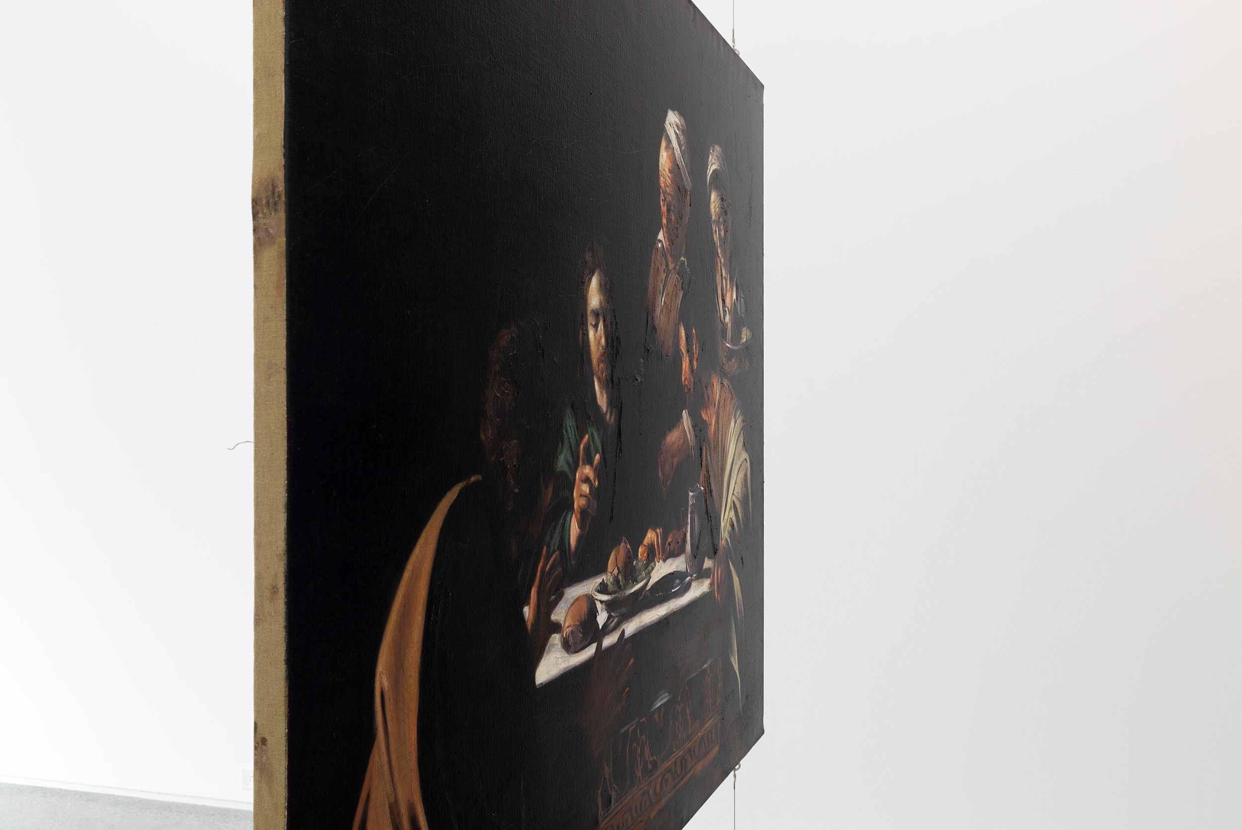 Back to the new painting. Manik’s quasi-forgery initially appears as if it is the “true” Caravaggio. Having never spied Supper at Emmaus in the flesh, Manik relied on a high-res image found on the internet—copied the image of the 1606 painting, readily available for anyone willing and wanting to view the Caravaggio. The painting’s varnish shows signs of cracking, and the linen on its verso shows weathering and aging, with a small patch on the lower-right-hand side, signalling some kind of conservation or overpainting efforts. Furthermore, the measurements of Manik’s Untitled (141 × 196 cm) match those of Supper at Emmaus (1601), and the composition faithfully mirrors that of the original.